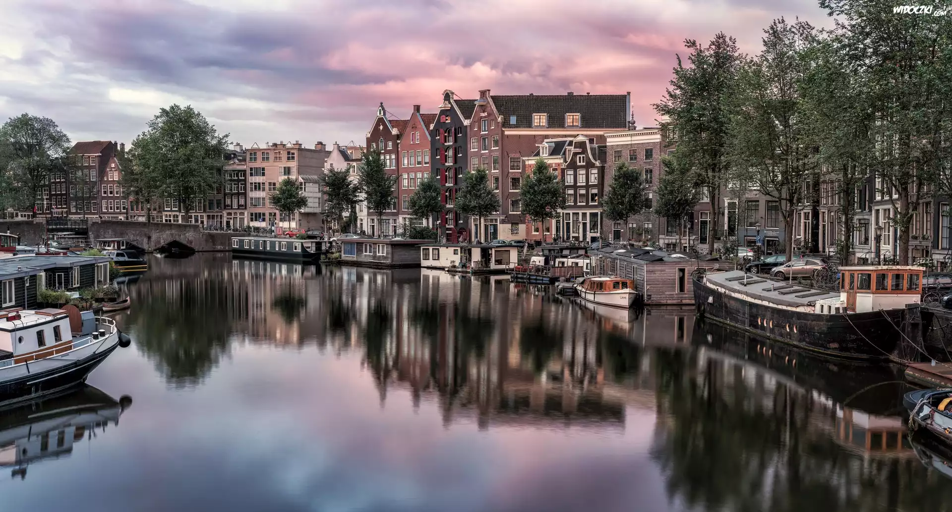 Holandia, Amsterdam, Domy, Drzewa, Rzeka, Kanał, Statki