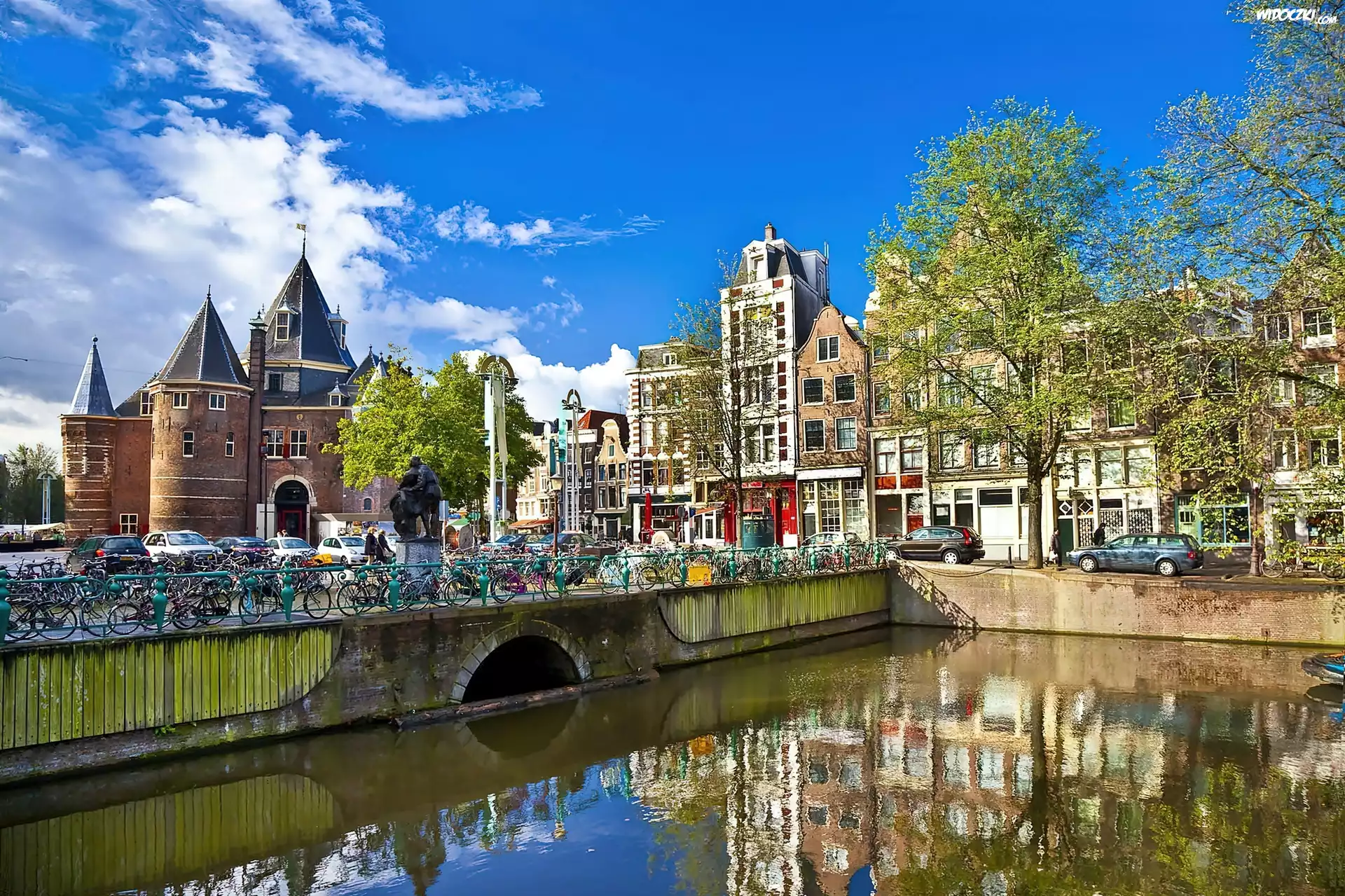 Zdjęcia, Amsterdam, Panorama, Miasta, Kanał, Most, Rowery