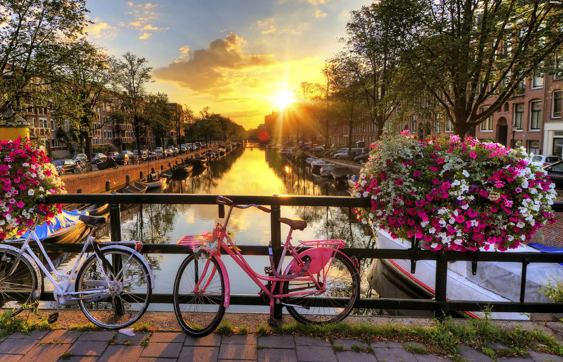 Amsterdam, Rzeka, Poranek, Most, Rowery, Kwiaty