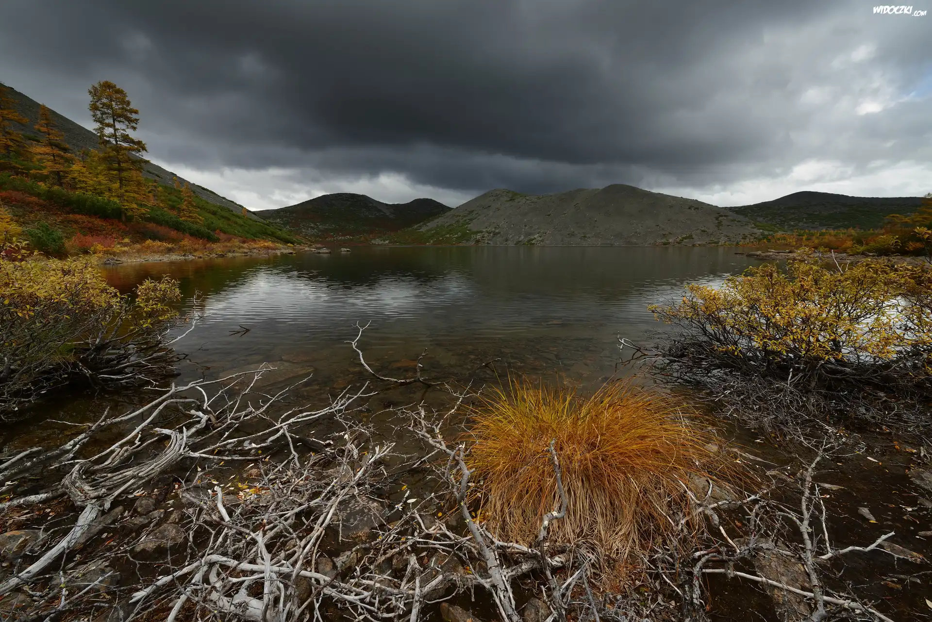 Zdjęcia, Góry, Jezioro Anemone, Kępka, Trawy, Suche, Gałęzie, Kołyma, Obwód magadański, Rosja
