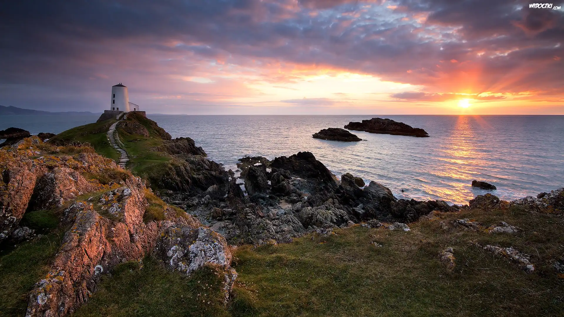 Zdjęcia, Latarnia morska Llanddwyn Lighthouse, Wyspa Anglesey, Walia, Morze, Skały, Wschód słońca, Chmury