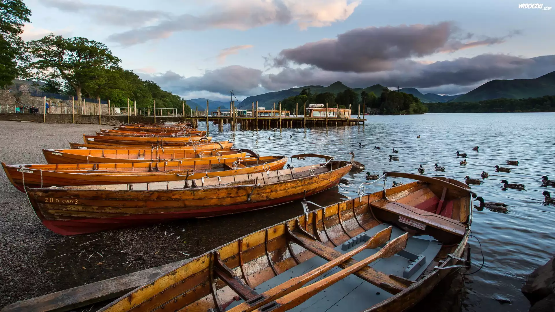 Zdjęcia, Łódki, Kaczki, Jezioro Derwent Water, Góry, Keswick, Anglia