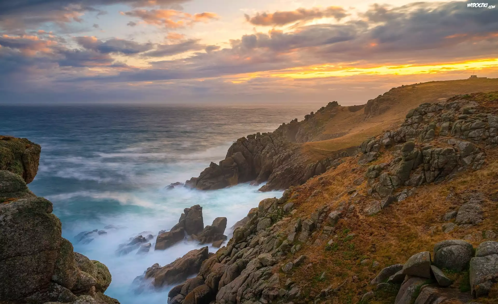 Zdjęcia, Morze, Wybrzeże, Kamienie, Zachód słońca, Półwysep Kornwalijski, Kornwalia, Anglia