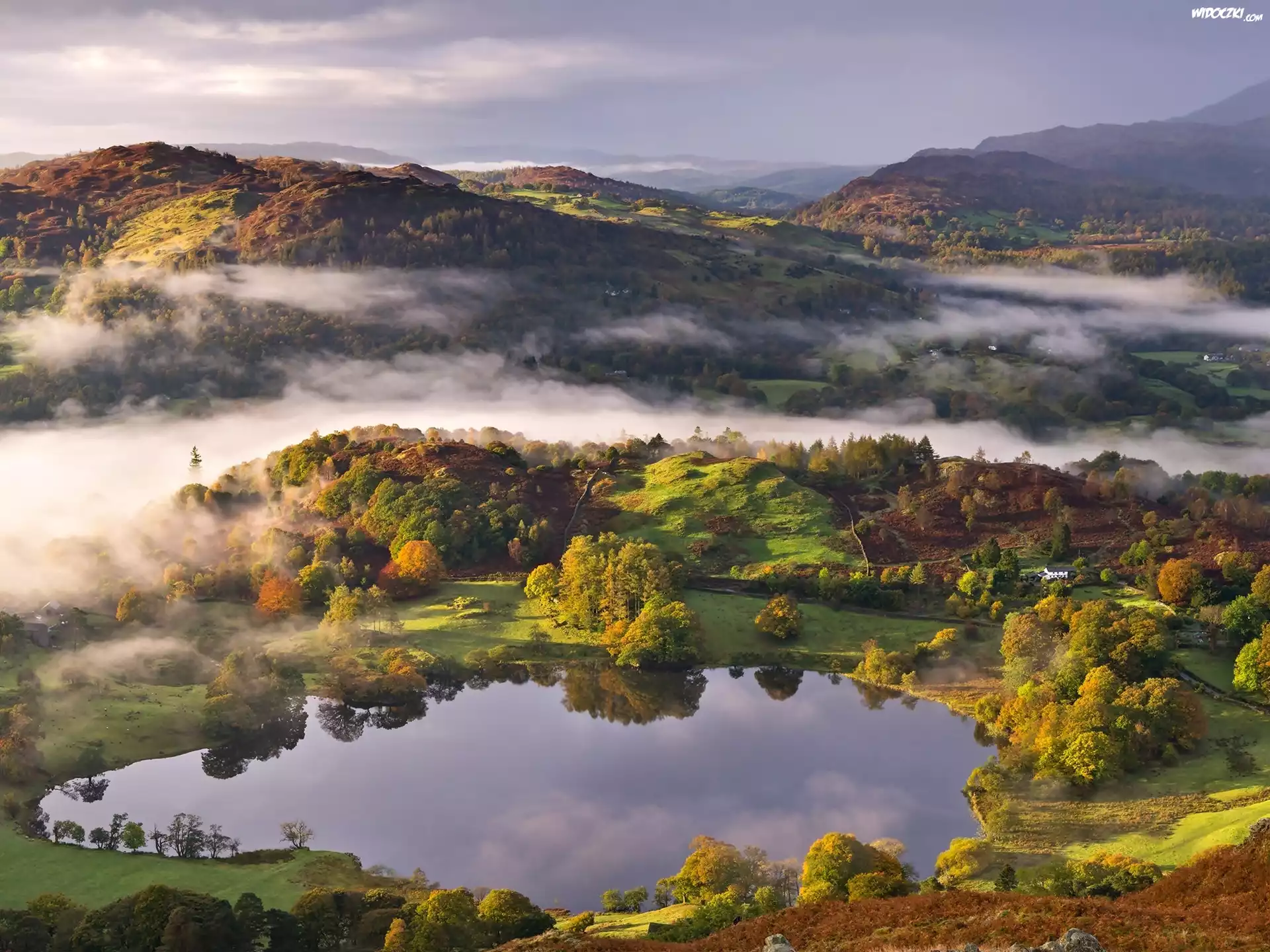 Park, Narodowy, Lake District, Góry, Lasy, Jezioro, Mgła, Anglia