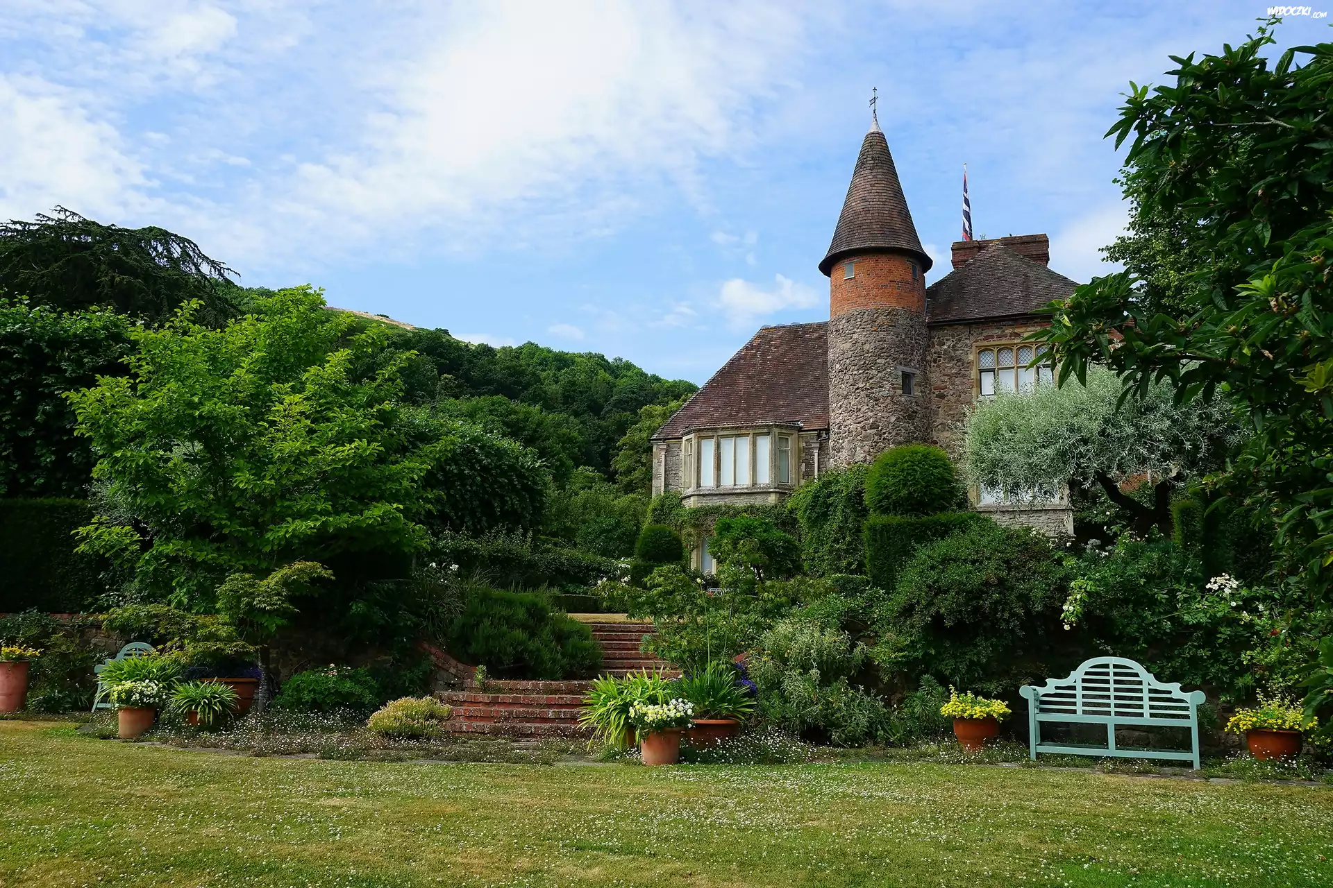 Zdjęcia, Wieś Little Malvern, Dworek, Ogród, Ławka, Hrabstwo Worcestershire, Anglia