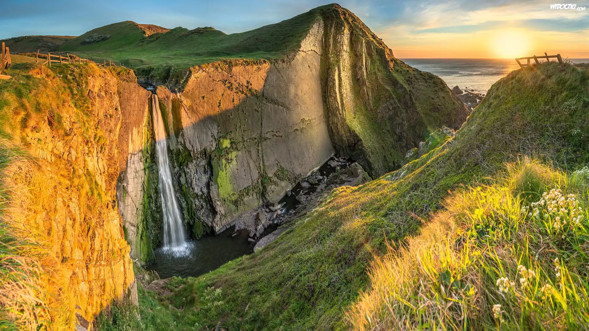 Anglia, Hrabstwo Devon, Góry, Morze, Wybrzeże Hartland, Wodospad, Spekes Mill Mouth Waterfall, Wąwóz, Skały, Roślinność, Wschód słońca |
