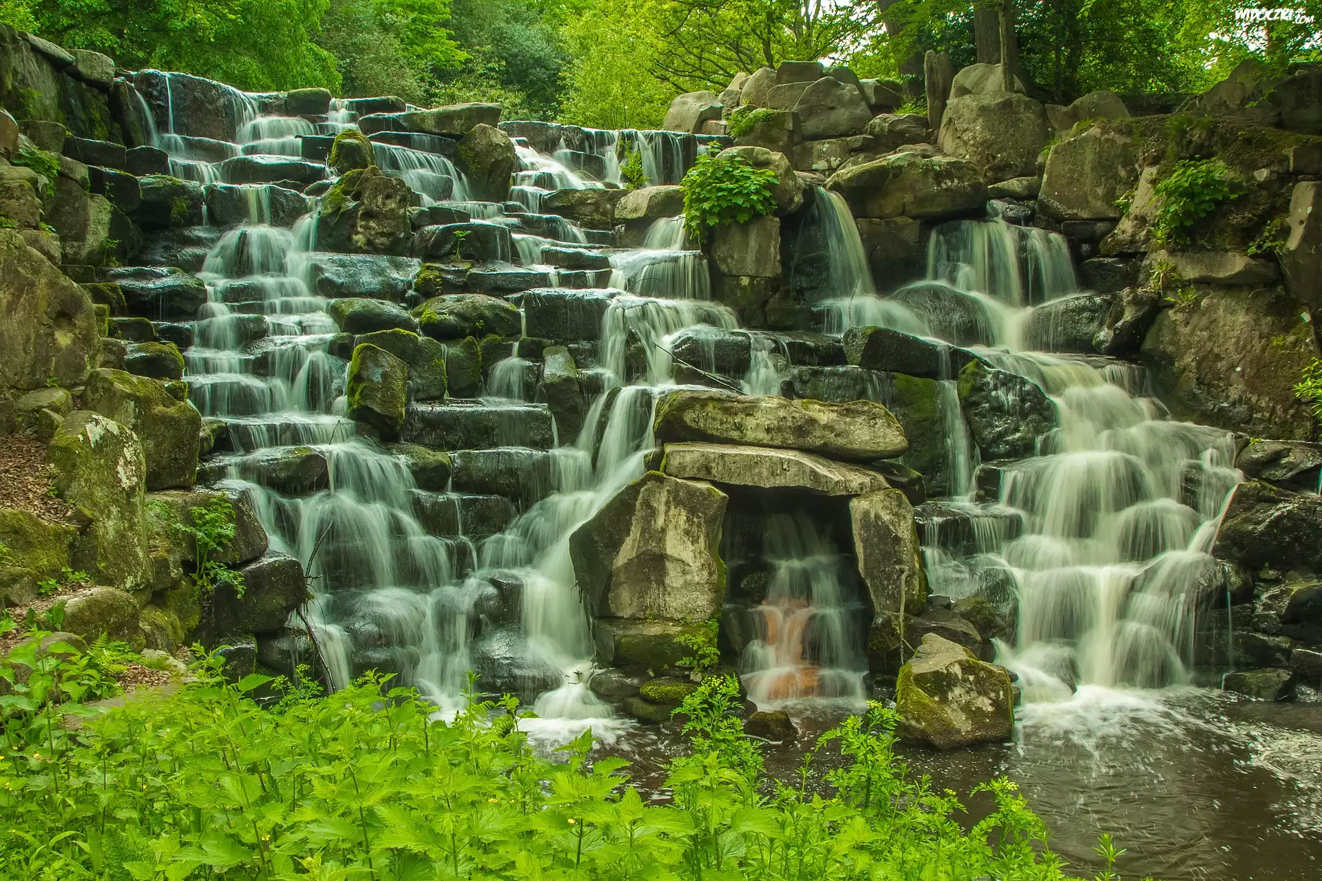 Anglia, Hrabstwo Surrey, Jezioro Virginia Water, Park Królewski, Windsor Great Park, Wodospad, Skały, Roślinność, Kamienie |