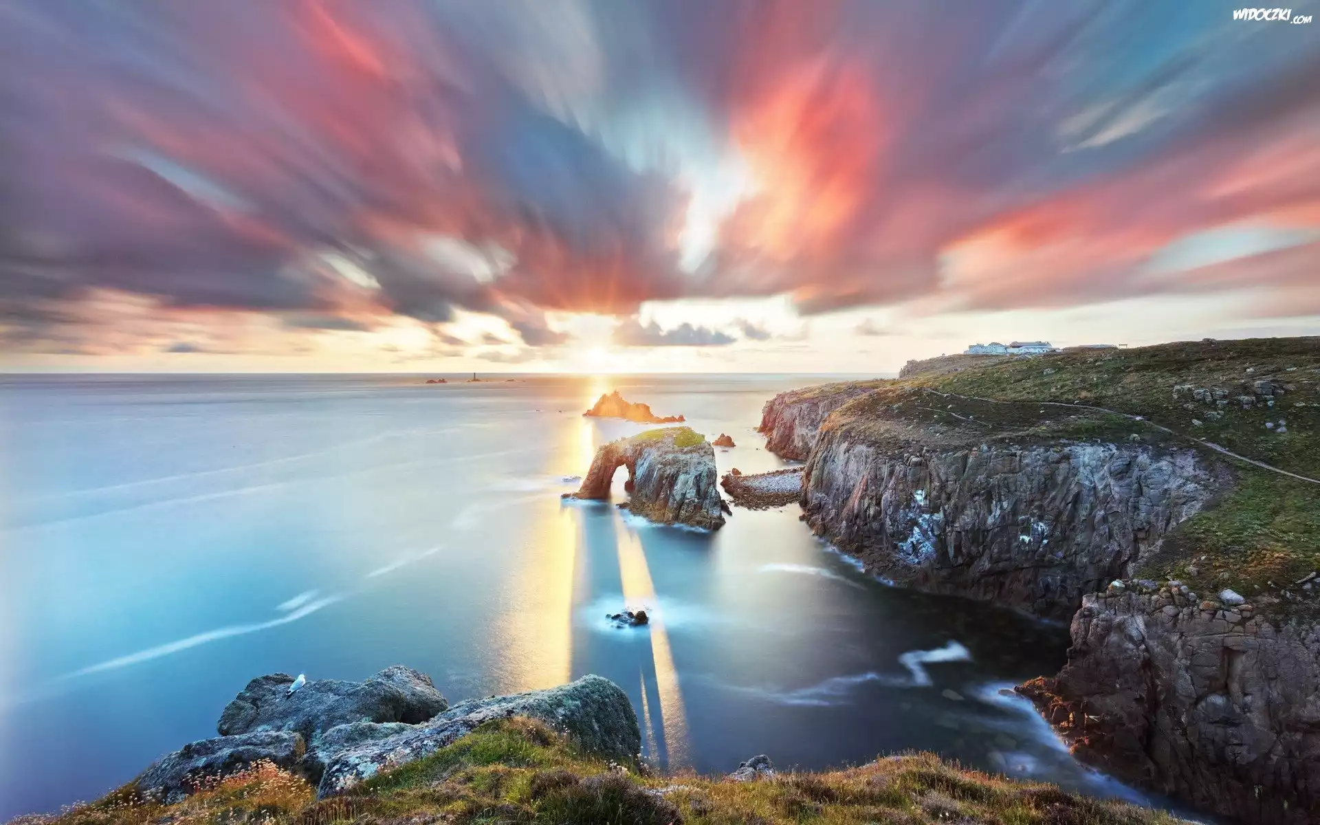 Zdjęcia, Anglia, Kornwalia, Morze, Skały, Wybrzeże, Chmury