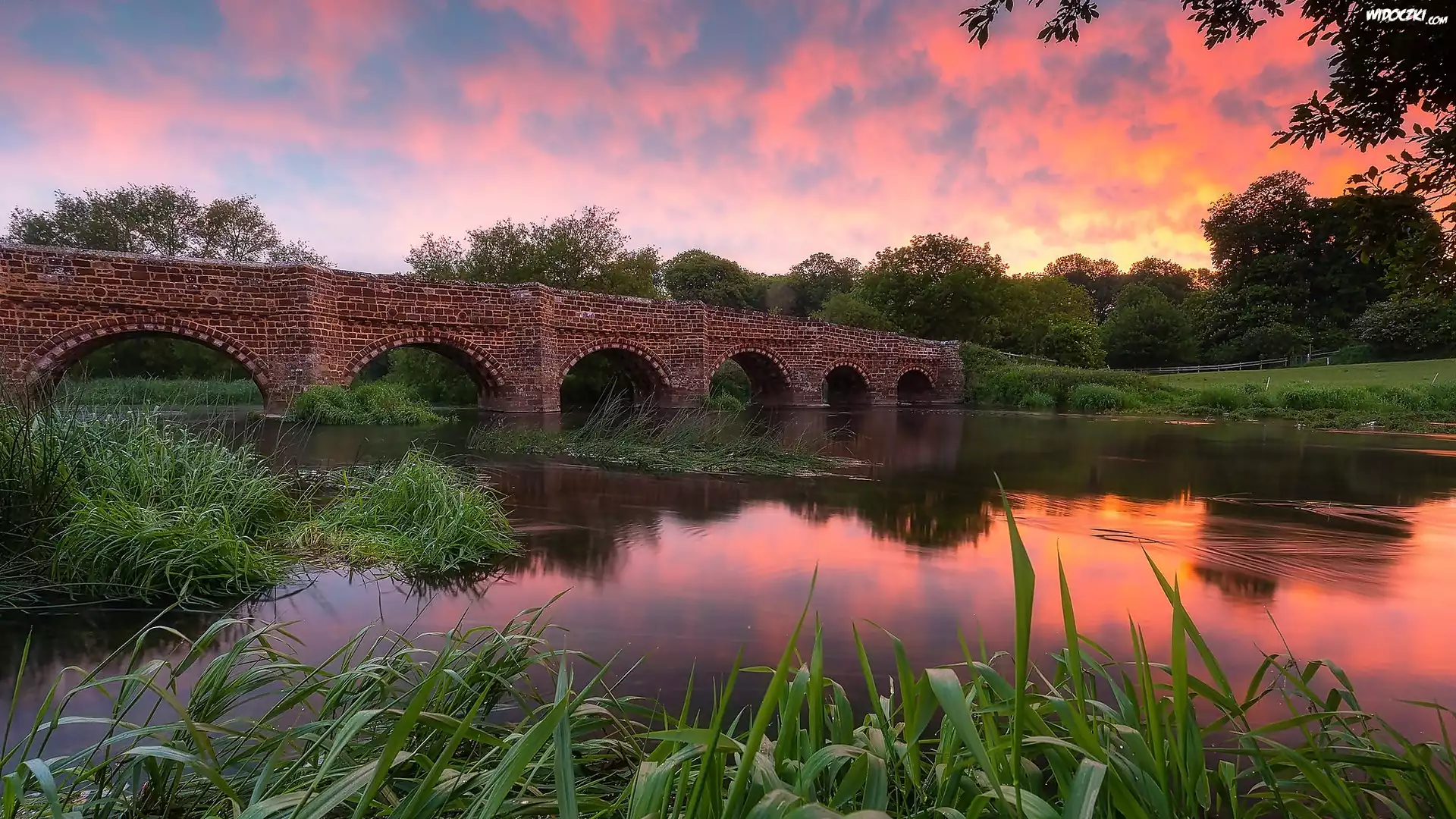 Anglia, Hrabstwo Dorset, Wieś Sturminster Marshall, Rzeka Stour, Most White Mill, Drzewa, Trawy, Roślinność, Zachód słońca |
