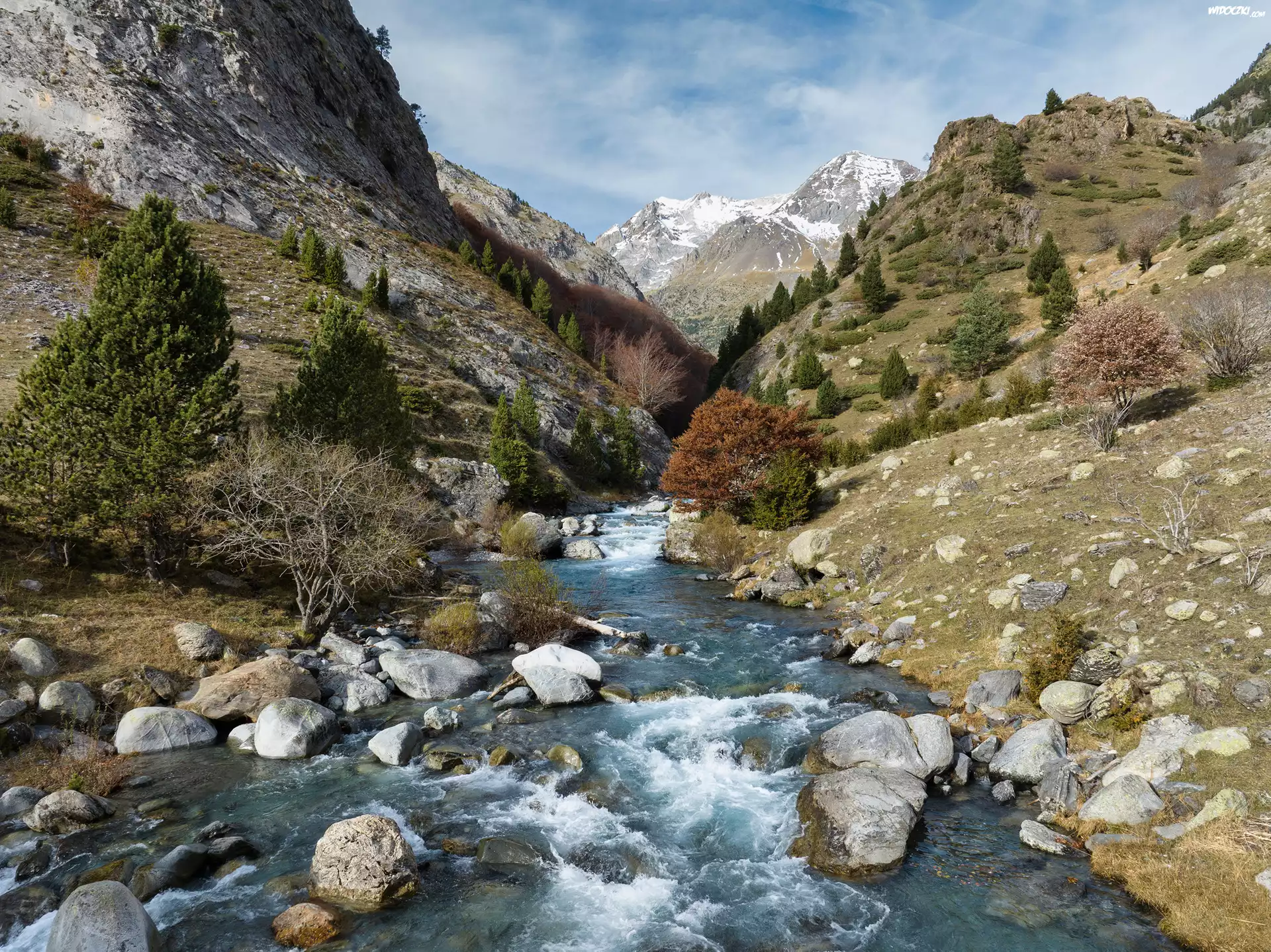 Zdjęcia, Hiszpania, Aragonia, Bujaruelo Valley, Góry, Pireneje, Niebo, Rzeka, Rio Ara, Kamienie, Drzewa