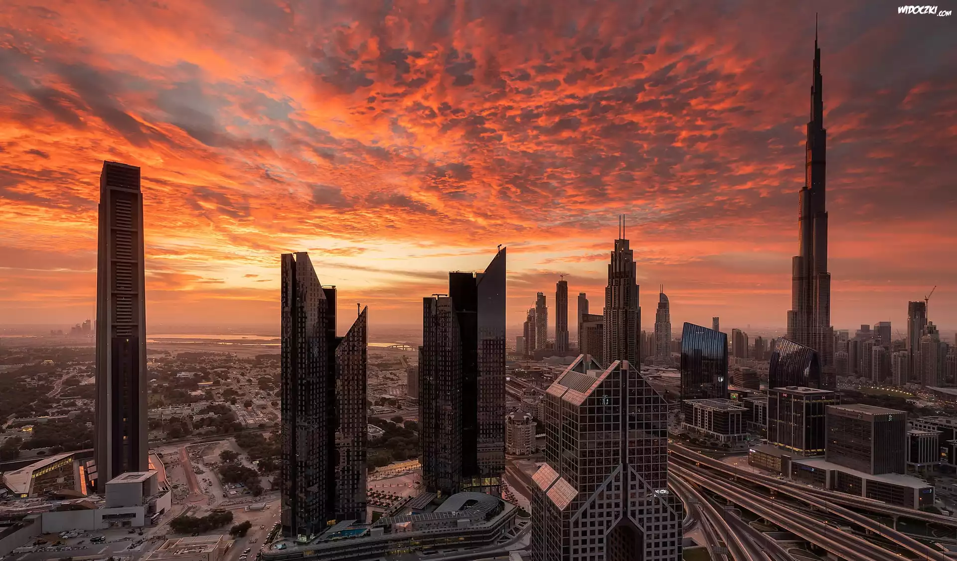 Zjednoczone Emiraty Arabskie, Dubaj, Drapacze chmur, Wieżowce, Zachód słońca, Niebo, Chmury