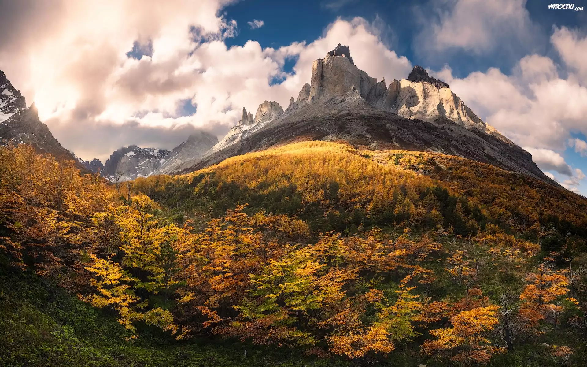 Argentyna, Patagonia, Góry, Masyw, Torres del Paine, Jesień, Chmury, Lasy