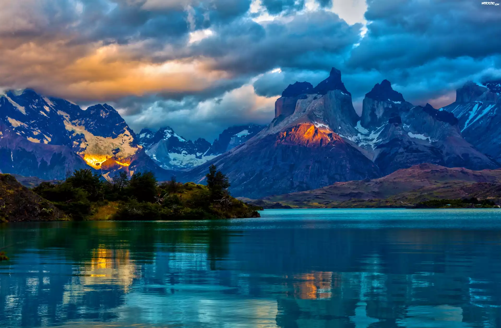 Argentyna, Patagonia, Góry, Jezioro, Drzewa, Chmury