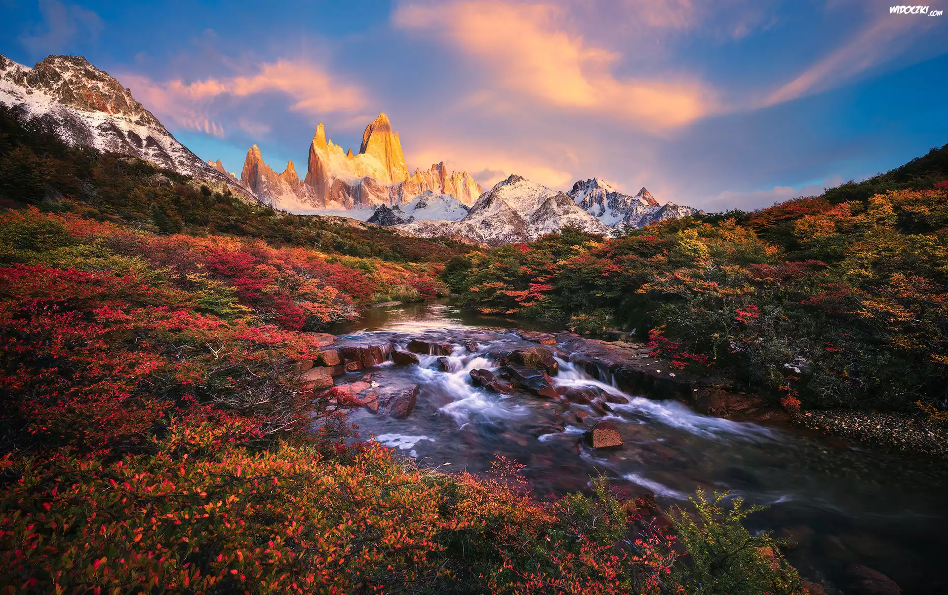 Argentyna, Patagonia, Góry, Szczyt, Fitz Roy, Jesień, Drzewa, Rzeka