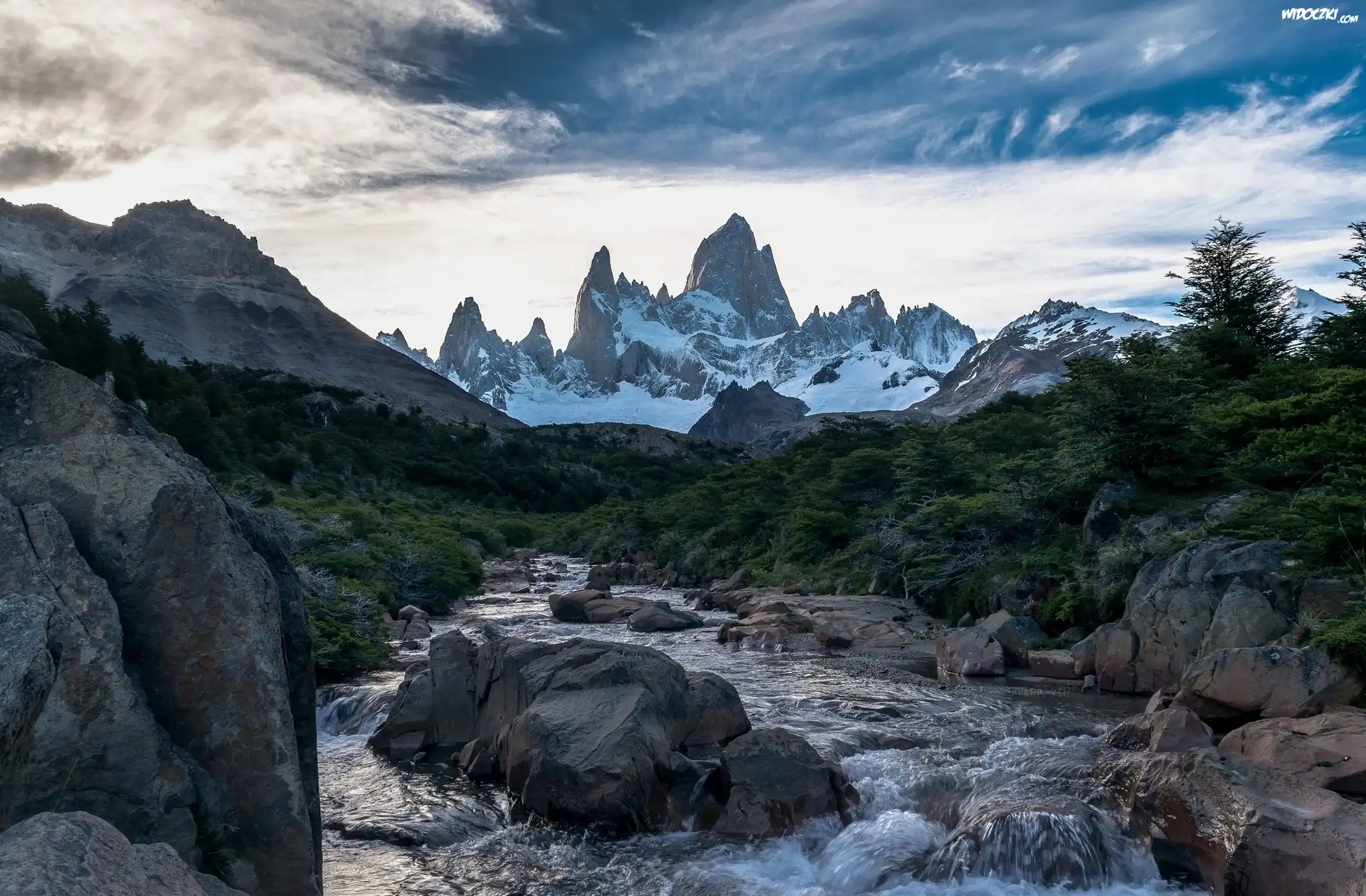 Argentyna, Chile, Pogranicze, Patagonia, Góry Andy, Szczyt Fitz Roy, Góry, Strumyk, Kamienie, Drzewa |