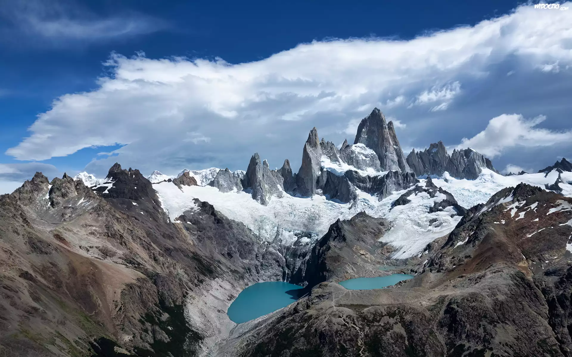 Argentyna, Patagonia, Ośnieżone, Góry, Szczyt Fitz Roy, Jeziora, Niebo