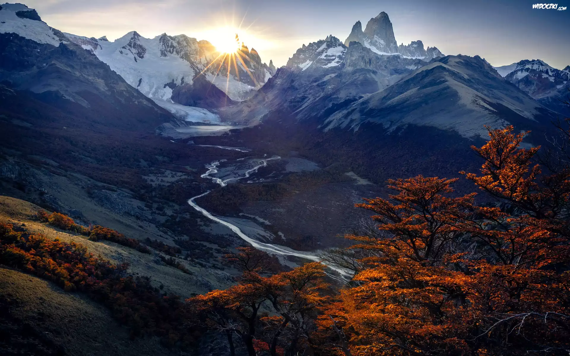 Zdjęcia, Argentyna, Patagonia, Góry, Andy, Rzeka, Promienie słońca, Jesień, Drzewa