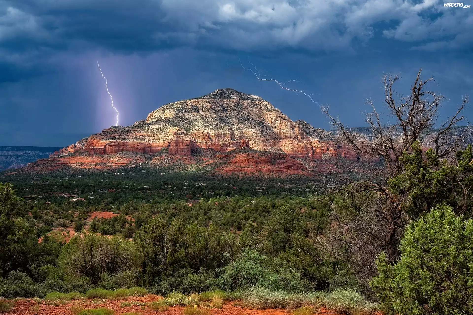 Stany Zjednoczone, Stan Arizona, Sedona, Góra, Thunder Mountain, Skały, Drzewa, Chmury, Błyskawica, Burza |