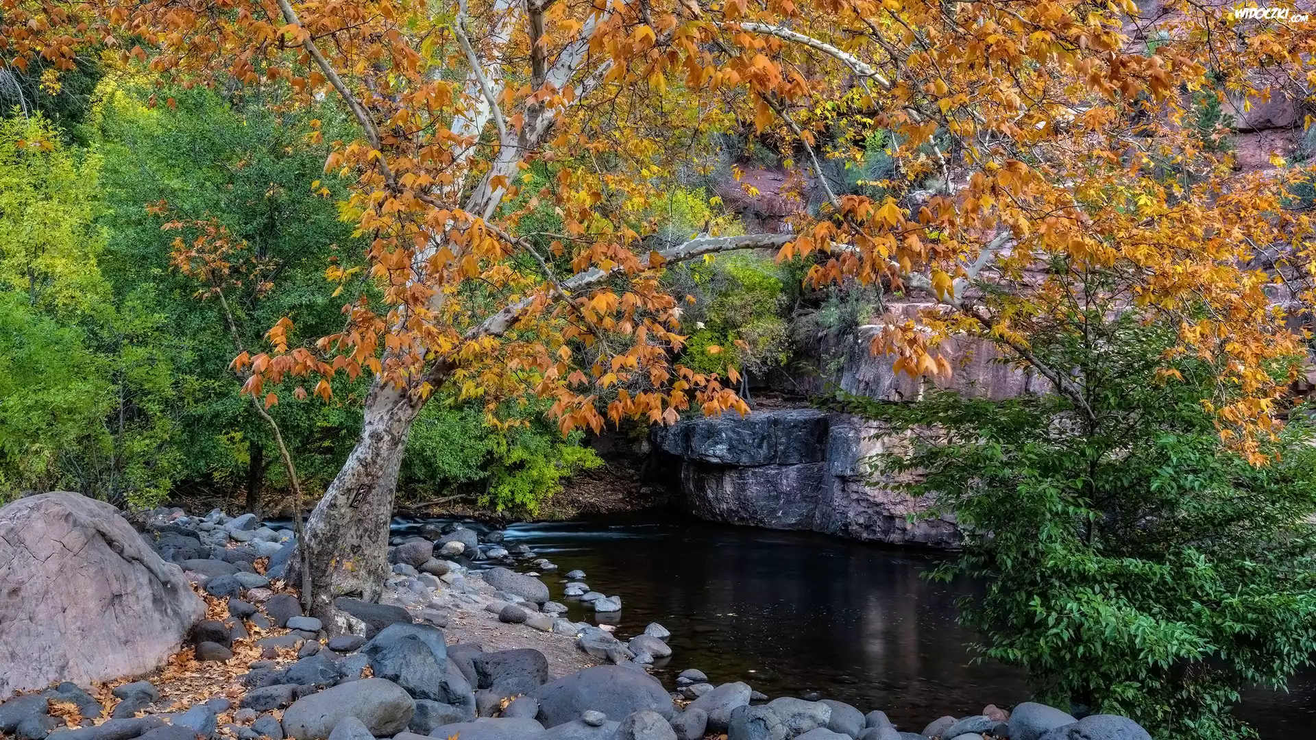 Jesień, Drzewa, Jawor, Kamienie, Rzeka, Grasshopper Point, Sedona, Stan Arizona, Stany Zjednoczone