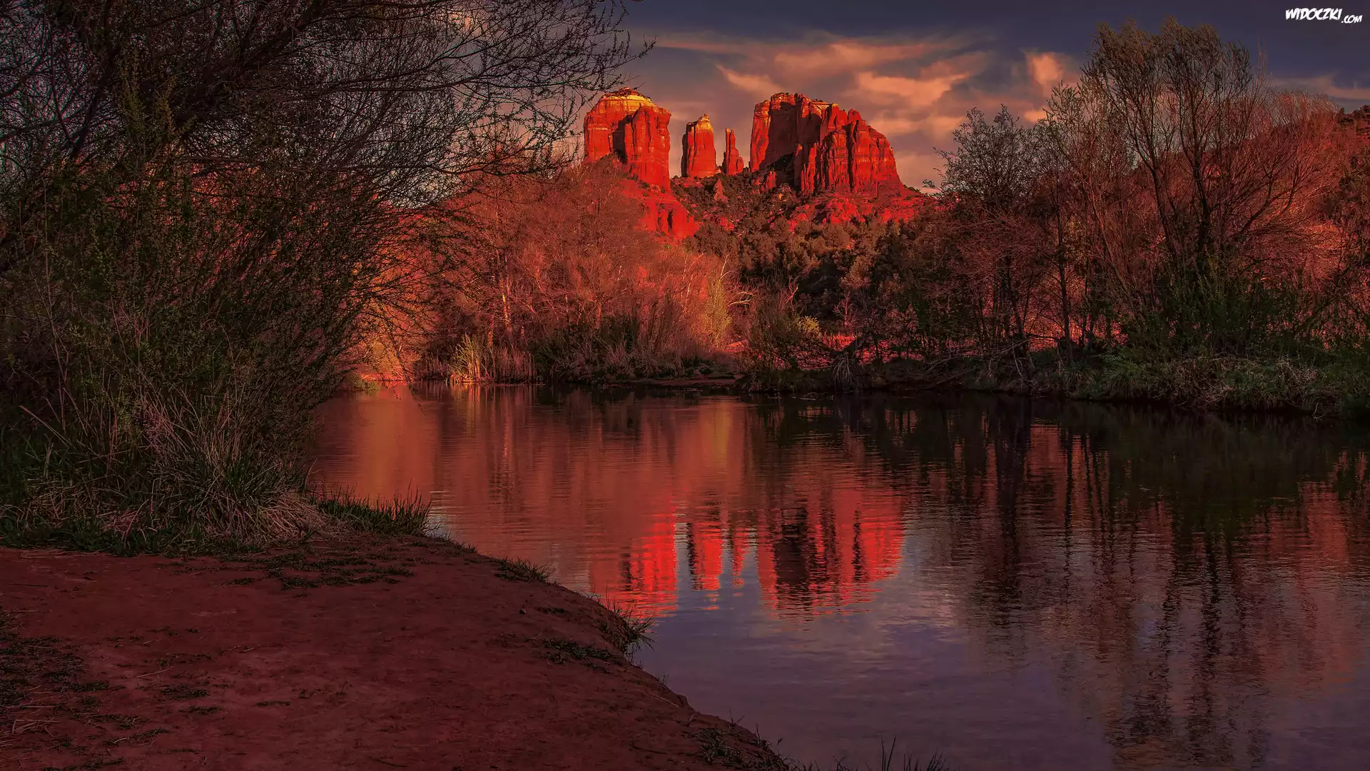 Zdjęcia, Góry, Czerwone, Skały, Cathedral Rock, Rzeka, Drzewa, Odbicie, Sedona, Arizona, Stany Zjednoczone