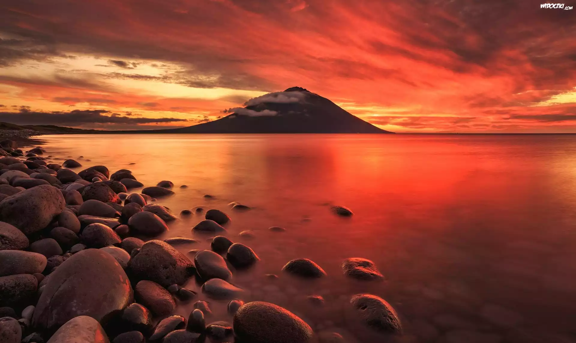 Zachód słońca, Góra, Startowulkan Atsonupuri, Morze, Kamienie, Wyspy Kurylskie, Wyspa Iturup, Obwód sachaliński, Rosja |