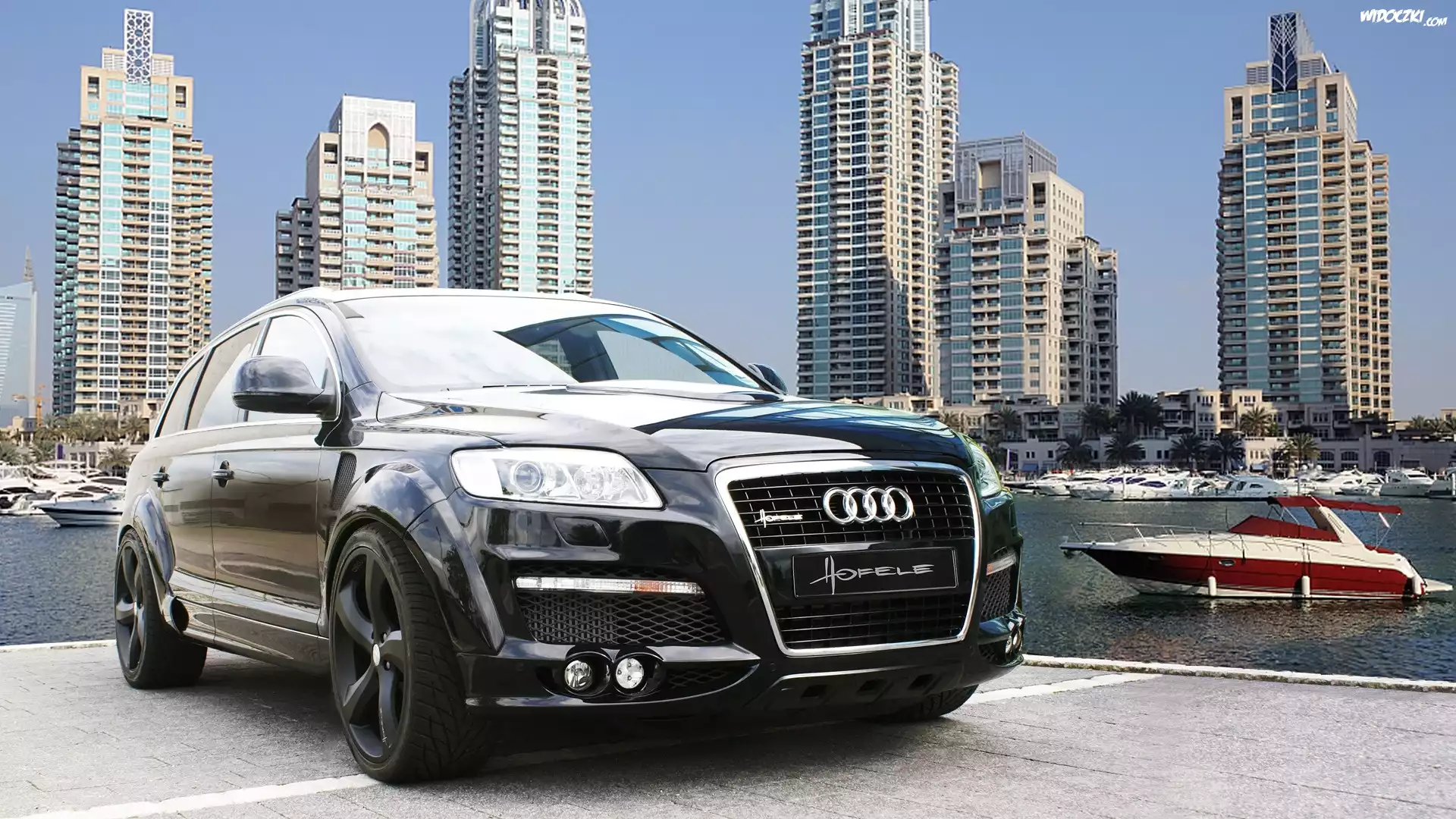 Zdjęcia, Audi Q7, Wieżowce, Miasto, Rzeka, Łódka