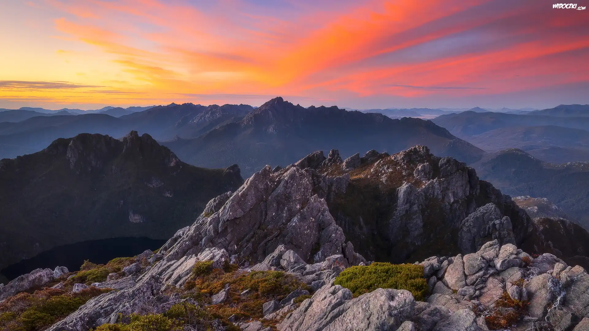 Zdjęcia, Zachód słońca, Góry, Arthur Range, Skały, Tasmania, Australia
