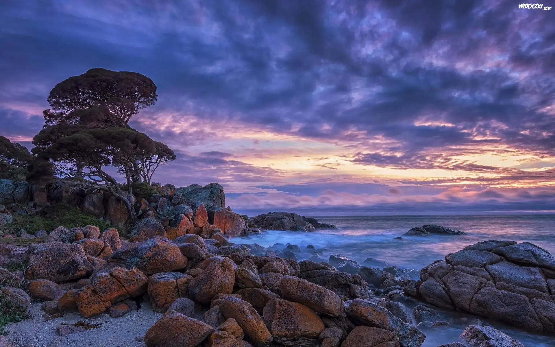 Zdjęcia, Wybrzeże, Shelley Cove, Skały, Kamienie, Morze, Drzewa, Niebo, Chmury, Australia