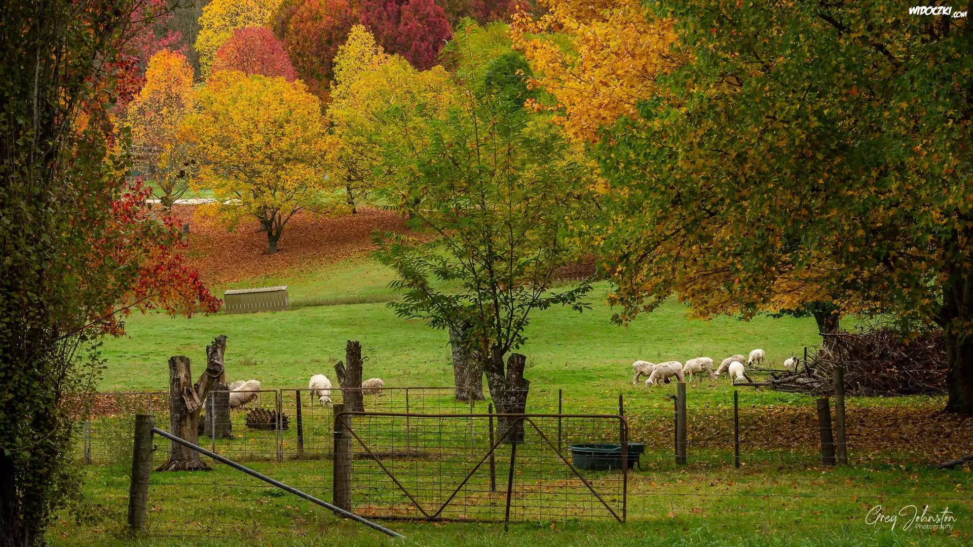 Zdjęcia, Jesień, Łąka, Zagroda, Drzewa, Owce, Wandiligong Valley, Stan Wiktoria, Australia