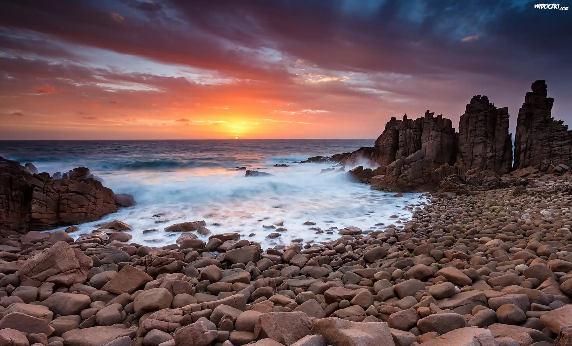 Australia, Morze, Skały, Kamienie, Zachód słońca