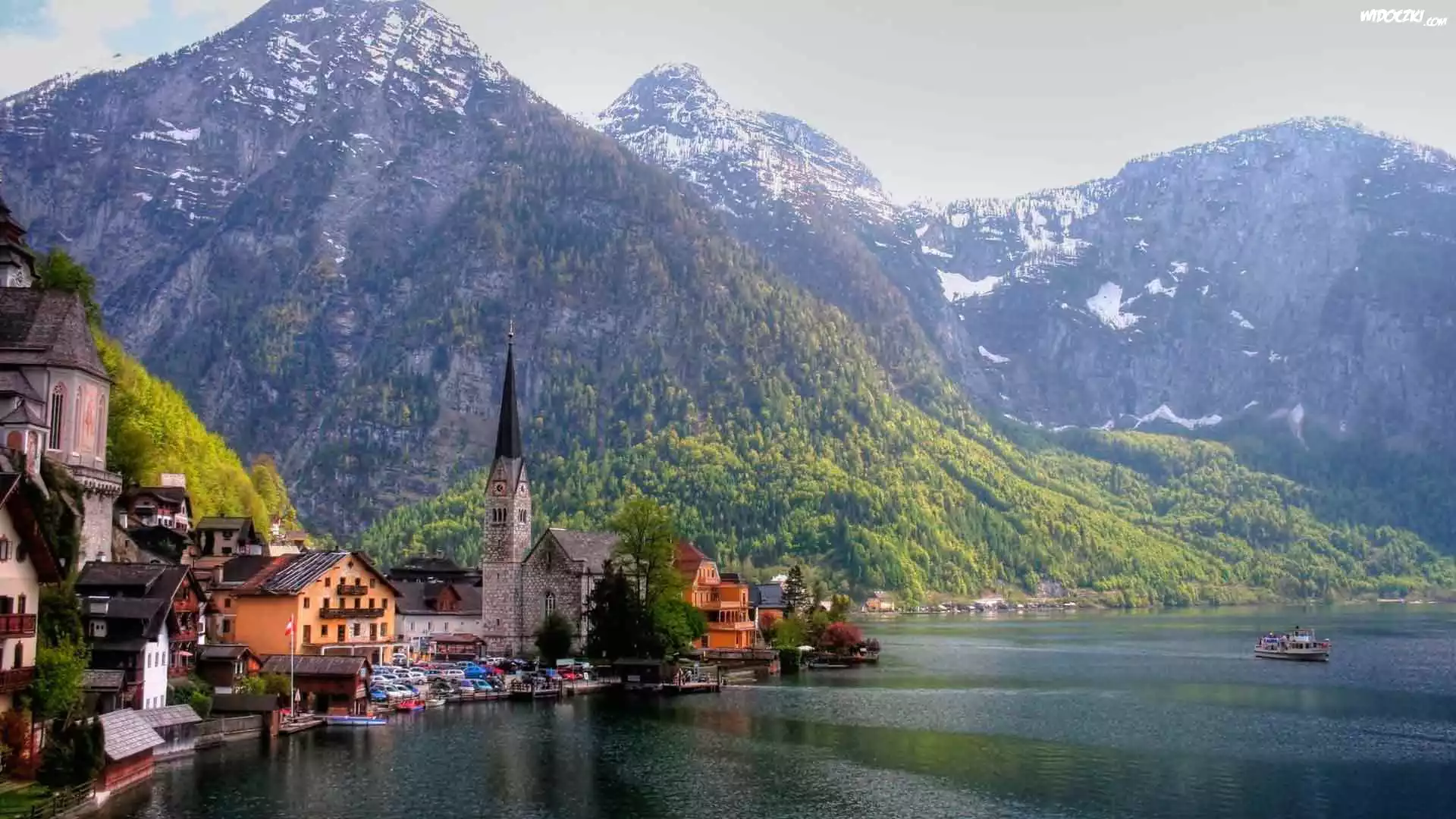 Zdjęcia, Austria, Góry Alpy Salzburskie, Miasteczko Hallstatt, Jezioro Hallstättersee, Kościół, Domy