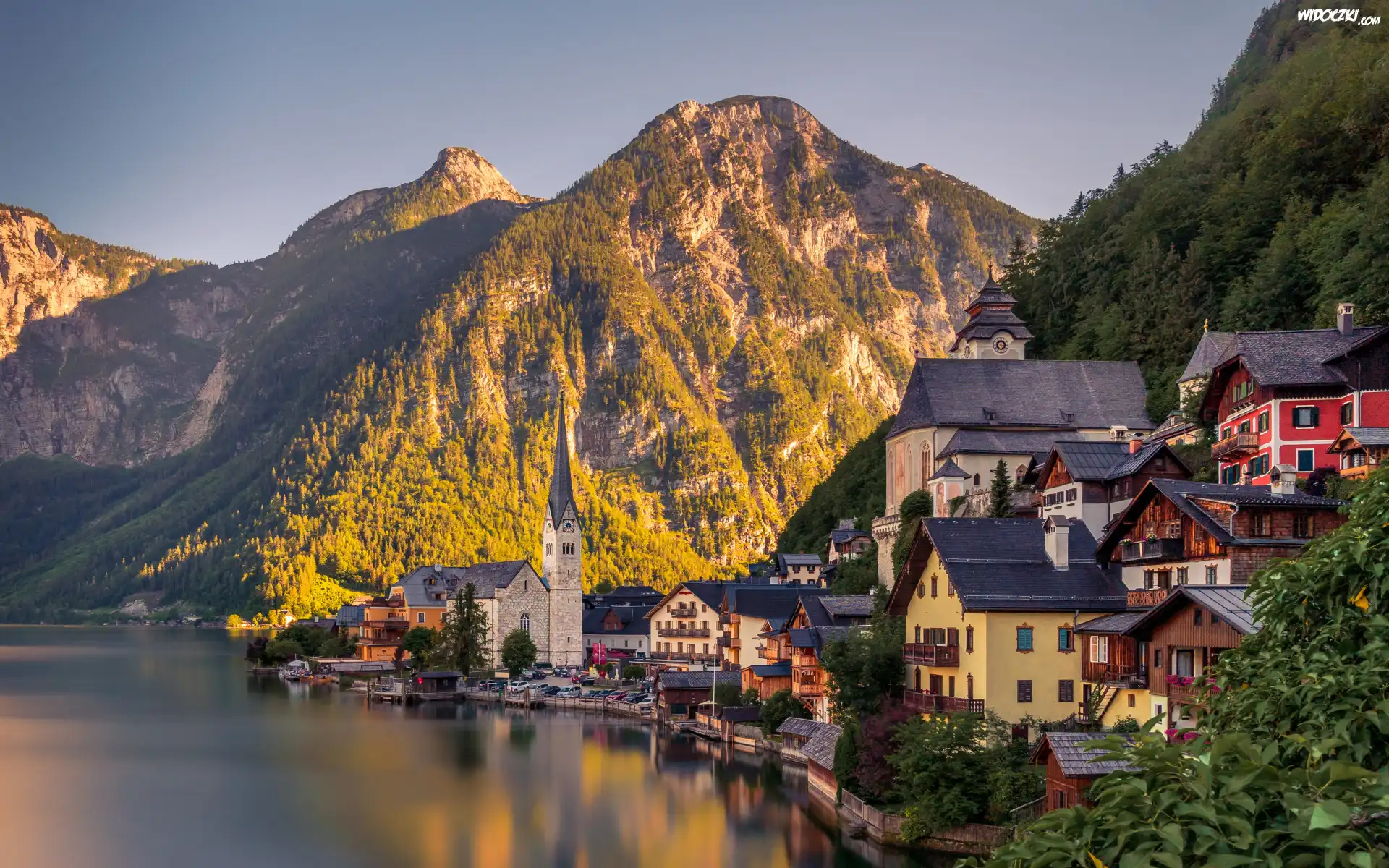 Zdjęcia, Zachód słońca, Góry, Jezioro Hallstattersee, Domy, Drzewa, Miasto, Hallstatt, Austria