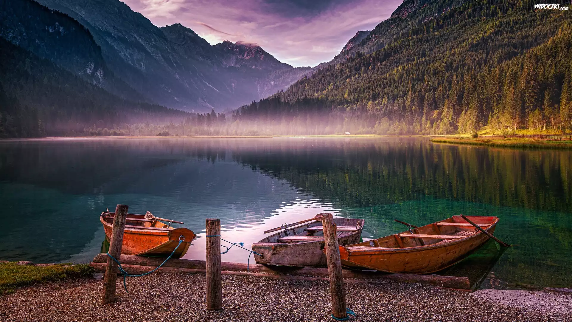 Zdjęcia, Góry, Jezioro Jagersee, Drzewa, Mgła, Trzy, Łódki, Pale, Austria