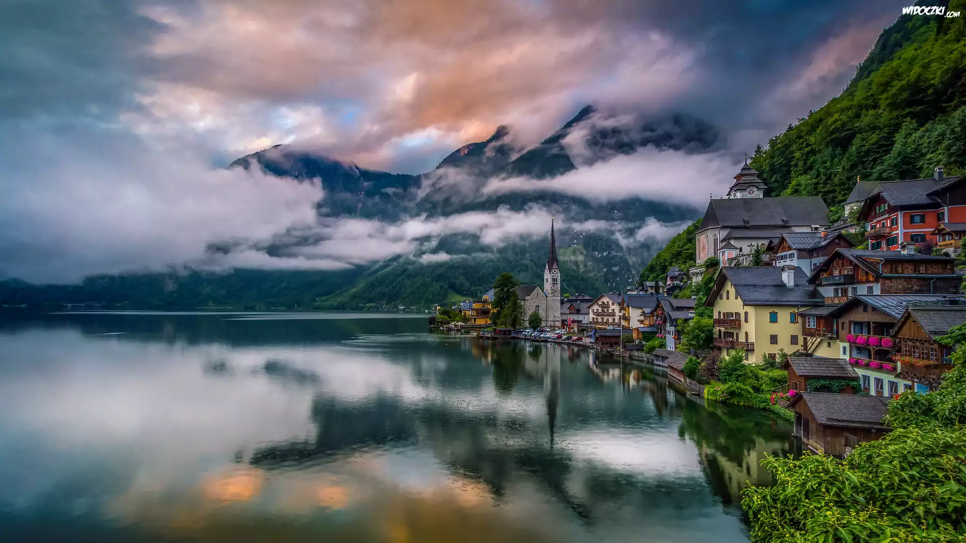 Mgła, Góry, Alpy Salzburskie, Jezioro Hallstattersee, Domy, Kościół, Hallstatt, Austria