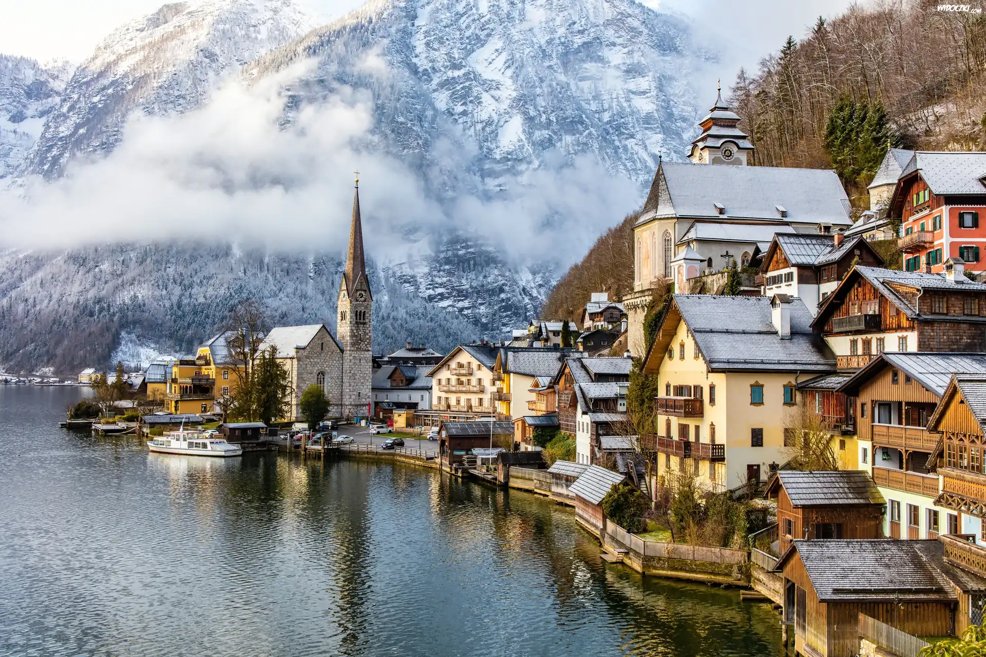 Austria, Hallstatt, Domy, Góry, Jezioro, Zima