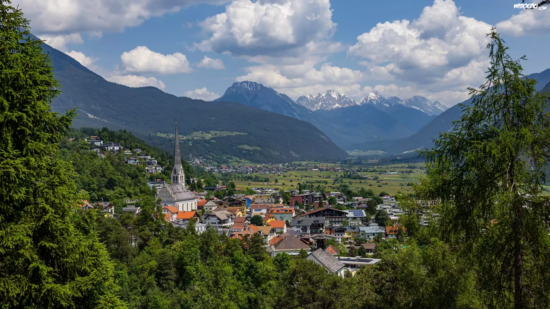 Góry, Alpy Lechtalskie, Domy, Drzewa, Miasto, Imst, Austria