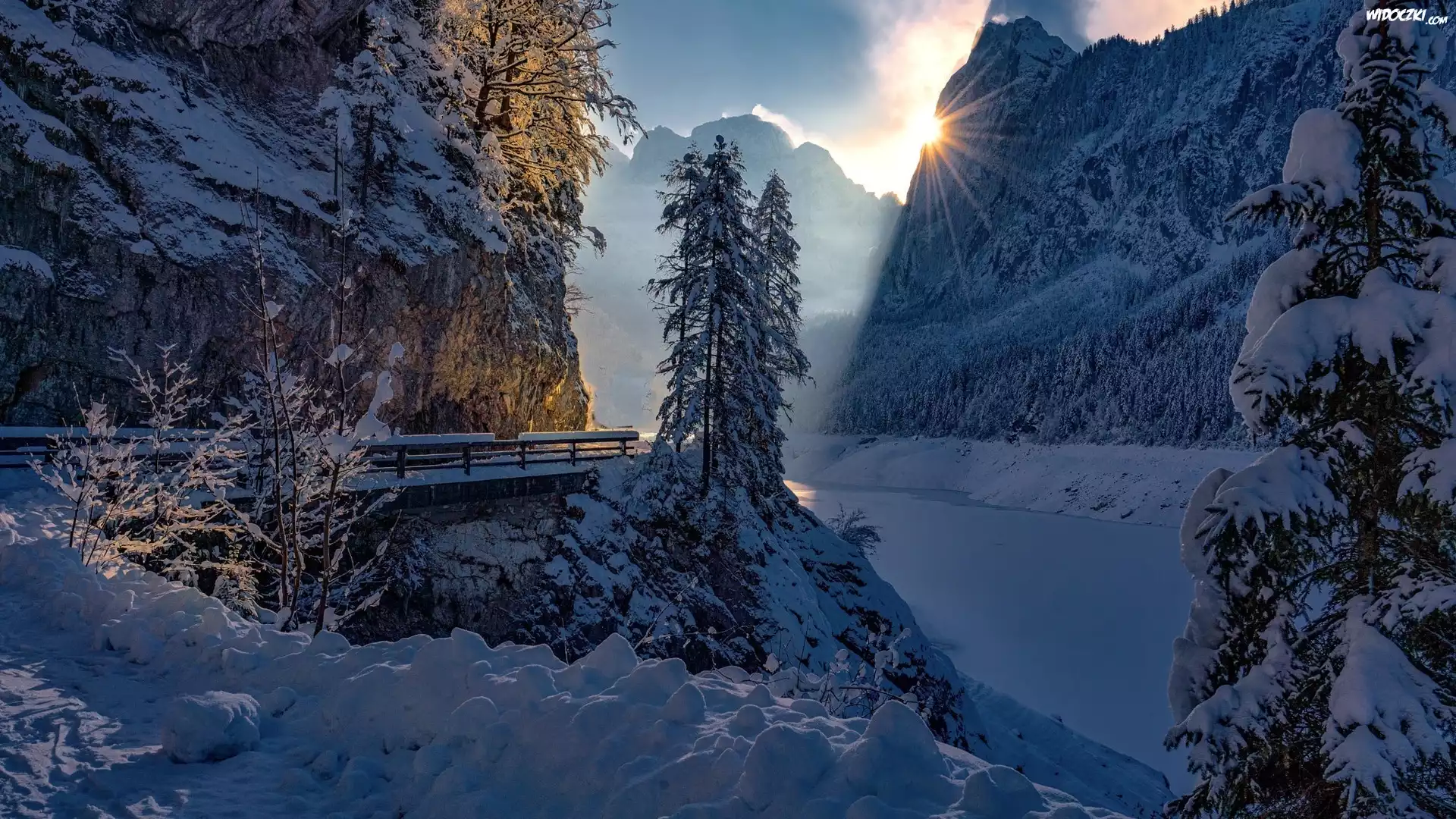 Austria, Zima, Góry, Ośnieżone, Drzewa, Most, Jezioro, Gosausee, Śnieg, Słońce