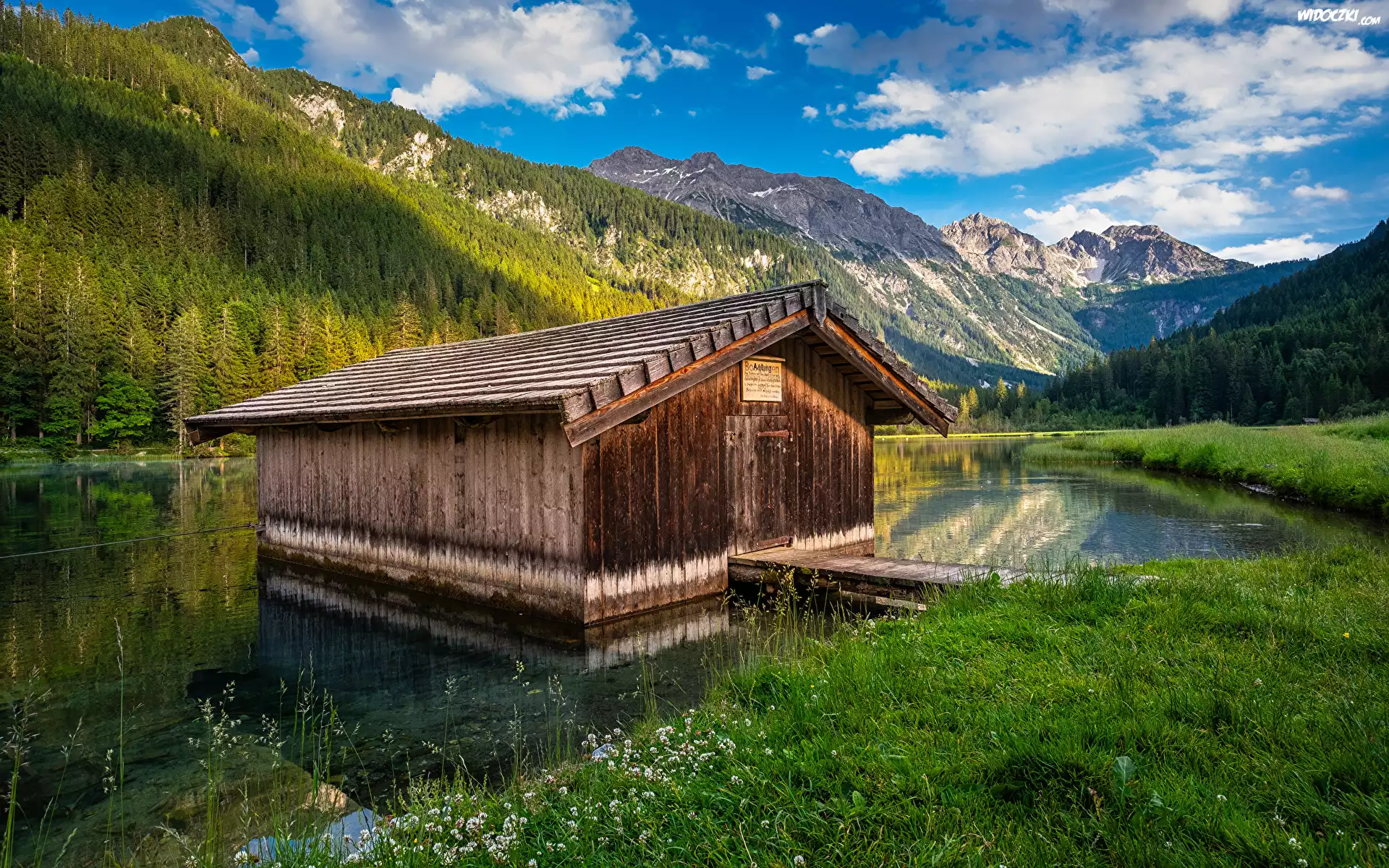 Austria, Góry, Alpy, Las, Jezioro, Domek, Szopa, Pomost, Trawa