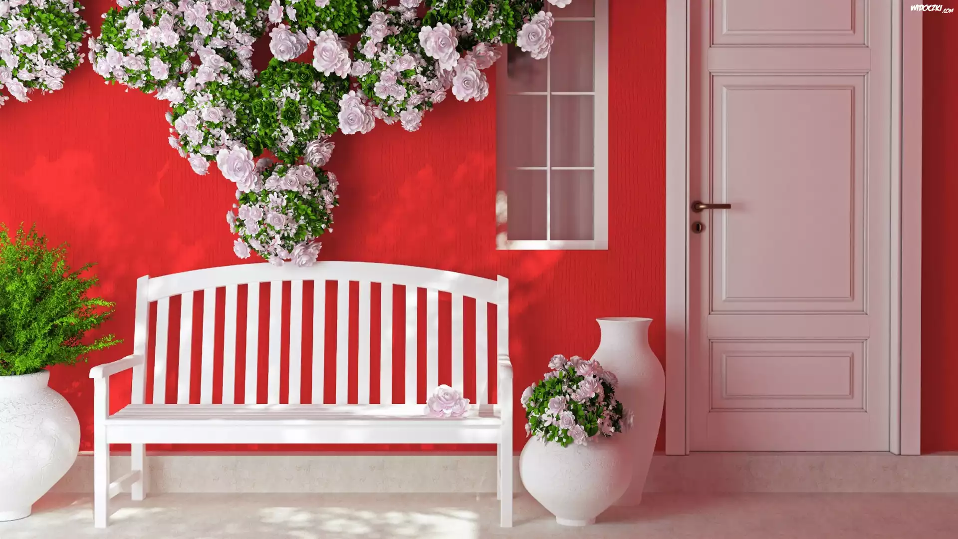 Ławeczka, Dzbany, Róże, Pnącze, Fasada, Dom, Drzwi