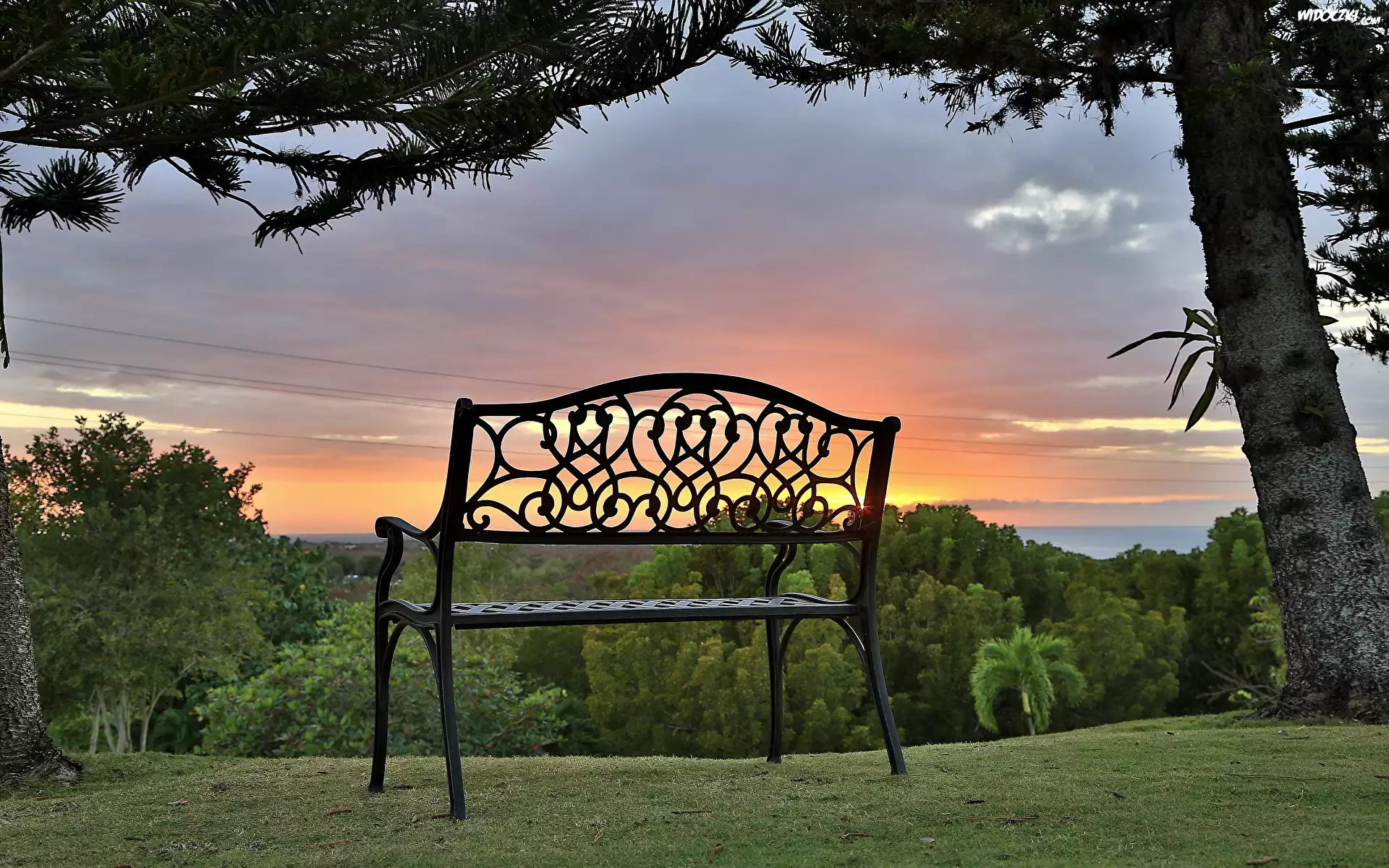 Zdjęcia, Ławka, Drzewa, Niebo, Chmury, Zachód słońca