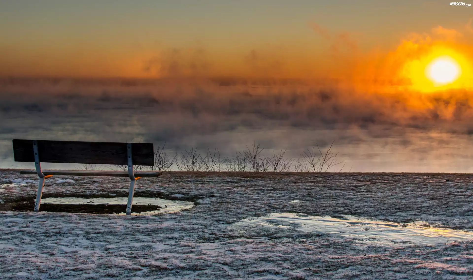 Zdjęcia, Ławka, Jezioro, Mgła, Zima, Zachód, Słońca