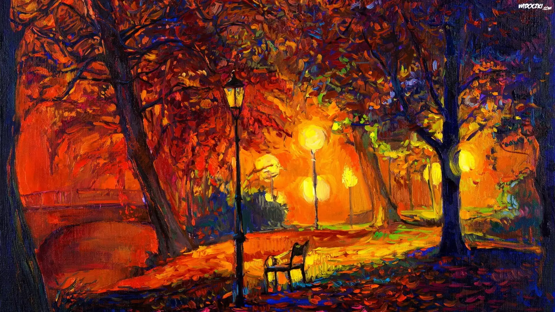 Zdjęcia, Obraz, Malarstwo, Boyan Dimitrov, Drzewa, Latarnie, Park, Wieczór, Ławka