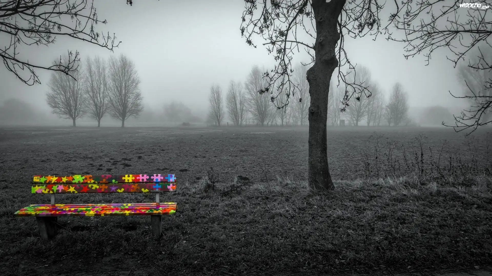 Zdjęcia, Kolorowa, Ławka, Czarno-białe, Pole, Drzewa, Mgła
