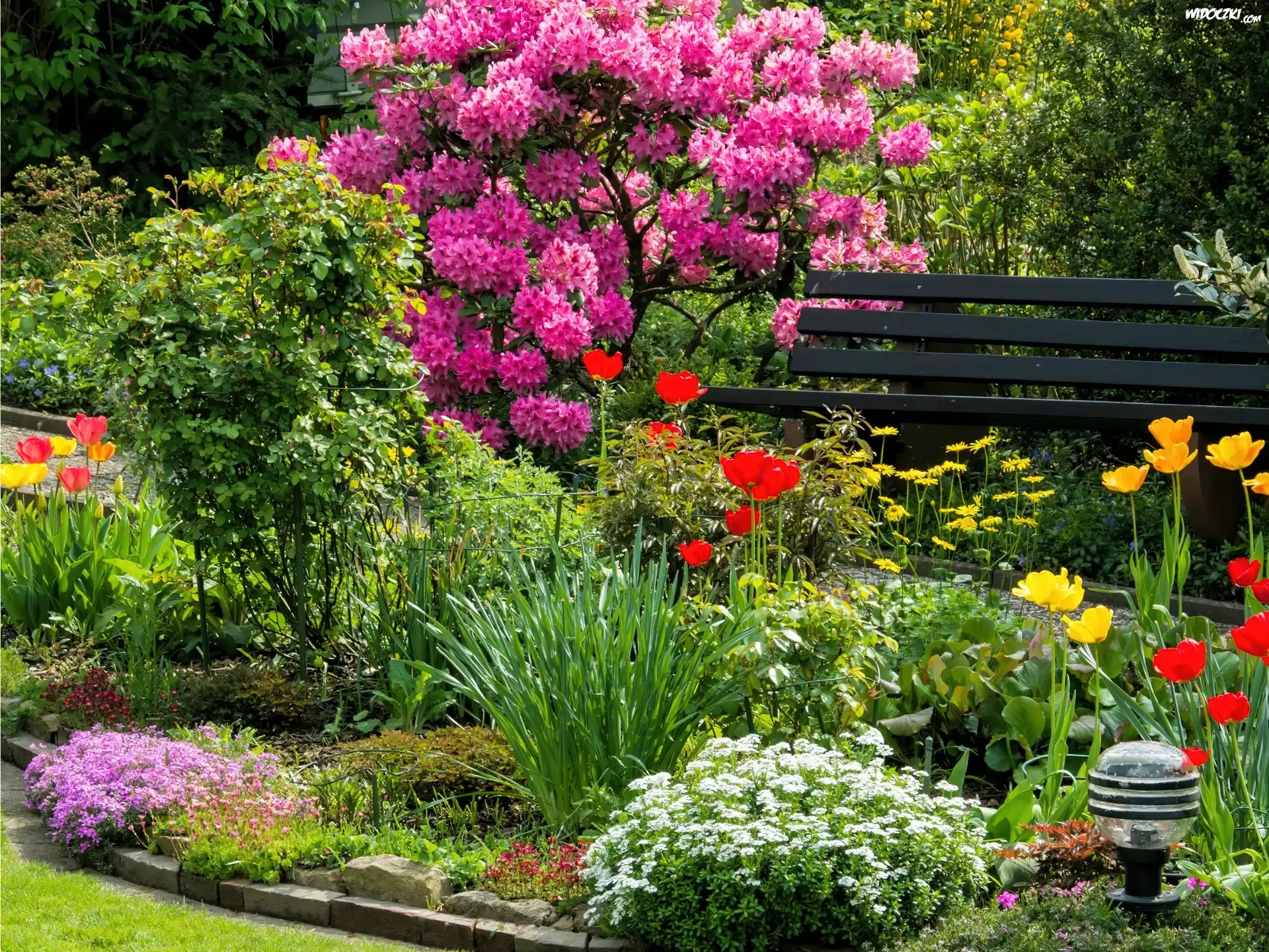 Zdjęcia, Kwietnik, Ławka, Kwiaty, Kwitnące, Drzewa, Ogród, Wiosna