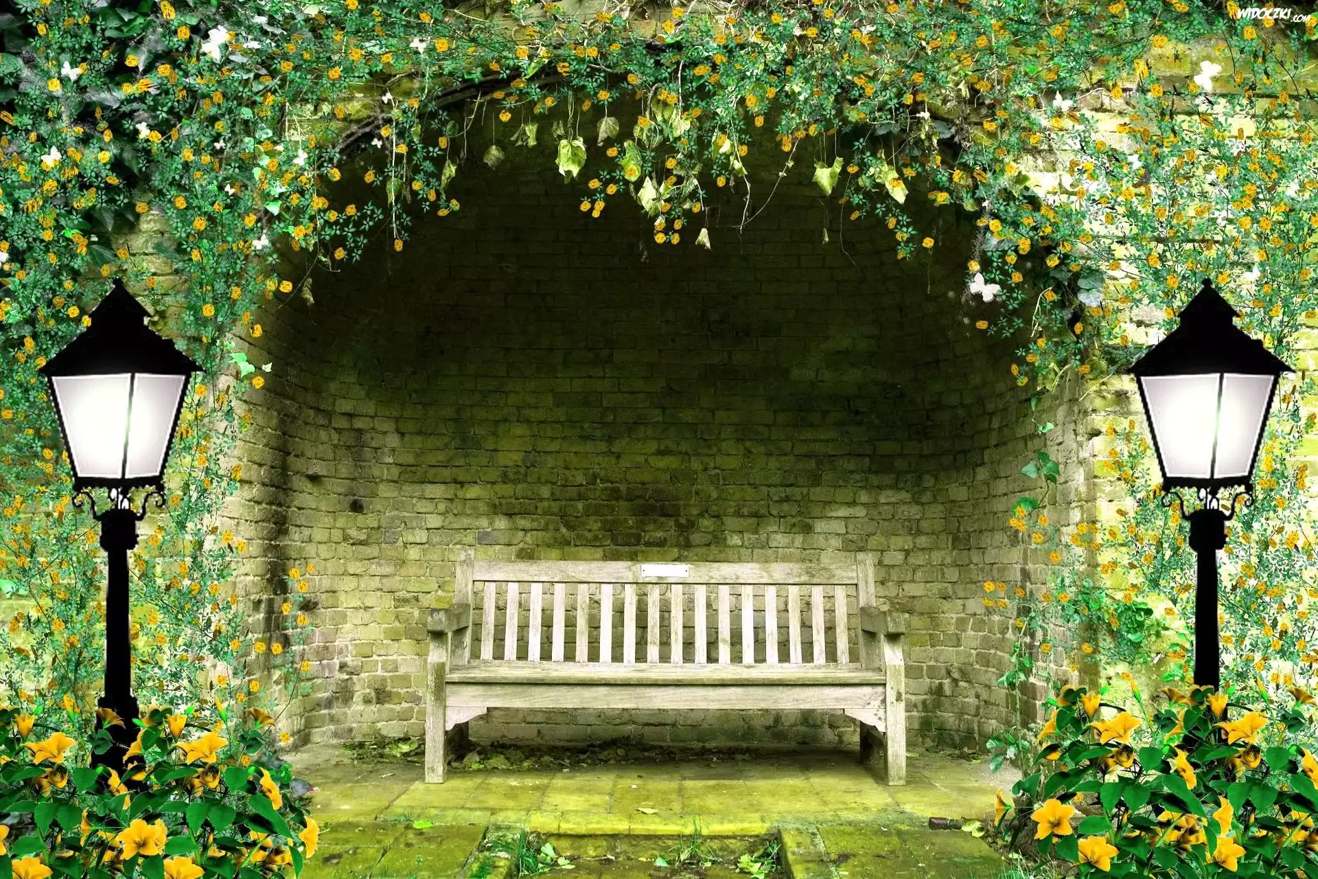 Zdjęcia, Ogród, Ławka, Latarnie