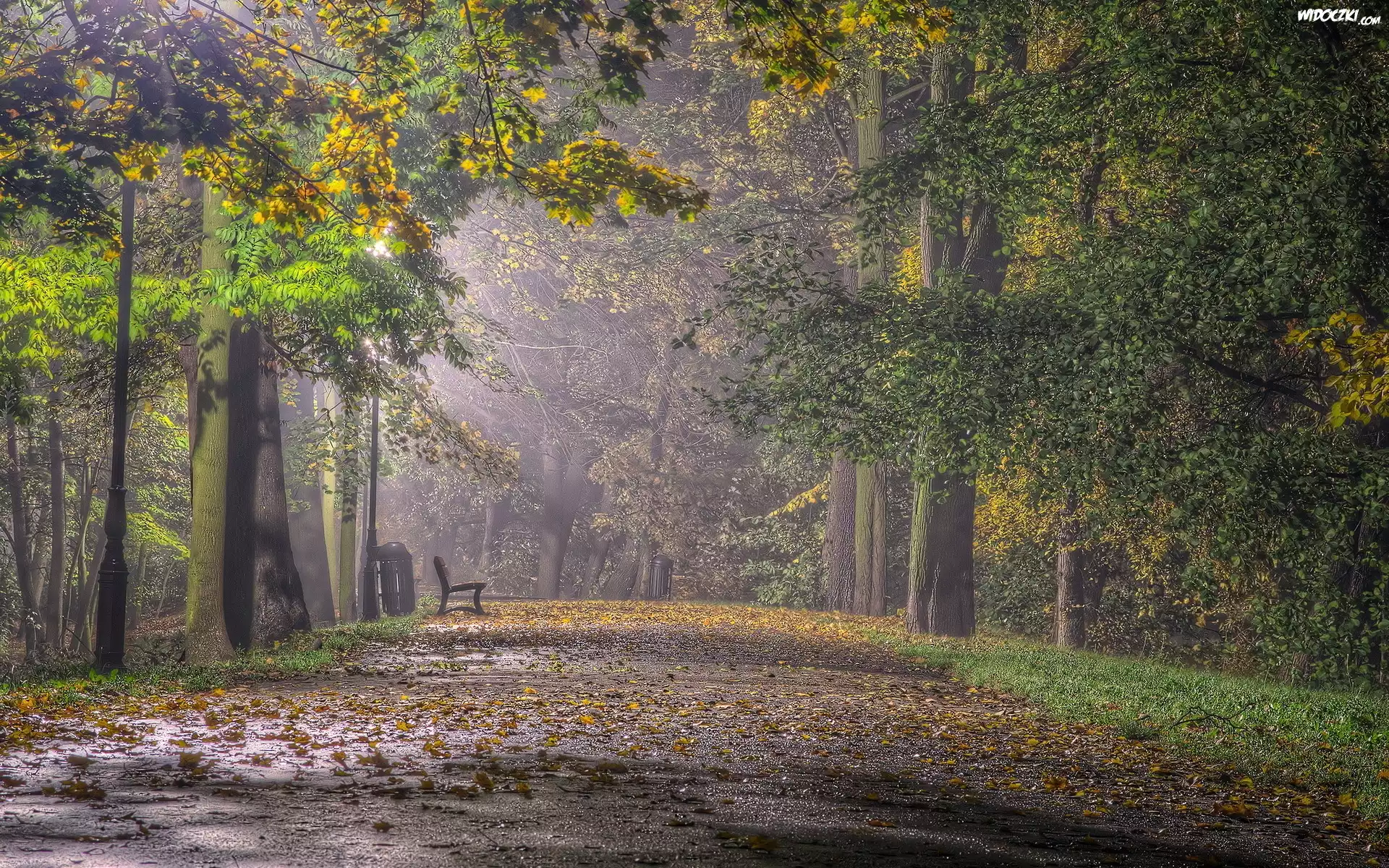 Park, Ławka, Liście, Przebijające, Światło, Mgła, Jesień