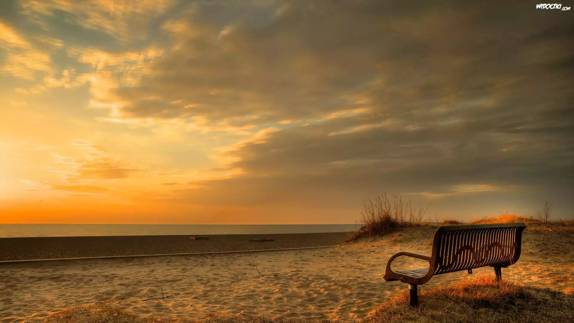 Zdjęcia, Plaża, Ławka, Trawy, Wschód, Słońca, Chmury, Morze
