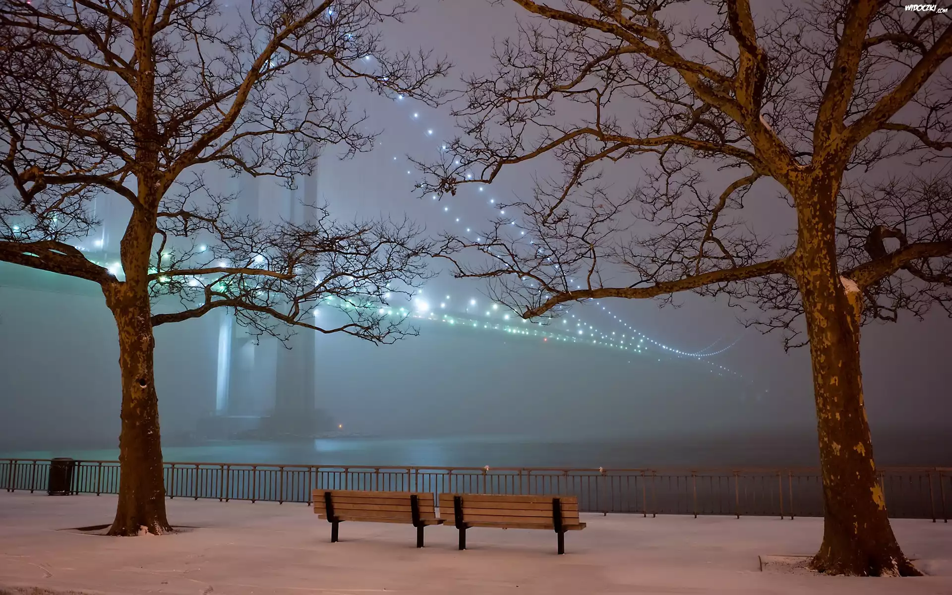 Ławki, Śnieg, Drzewa, Most, Światła, Noc