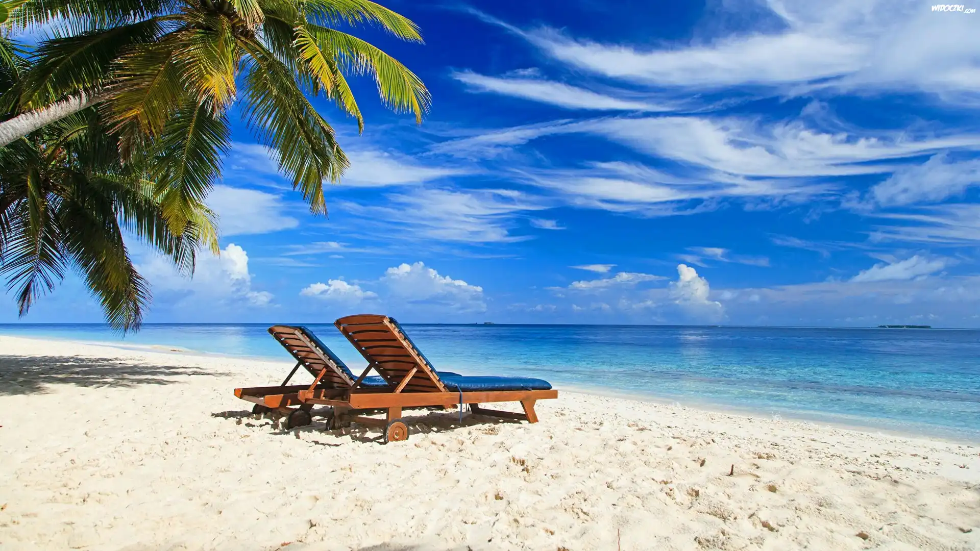 Zdjęcia, Bahamy, Plaża, Morze, Palmy, Leżaki, Chmury