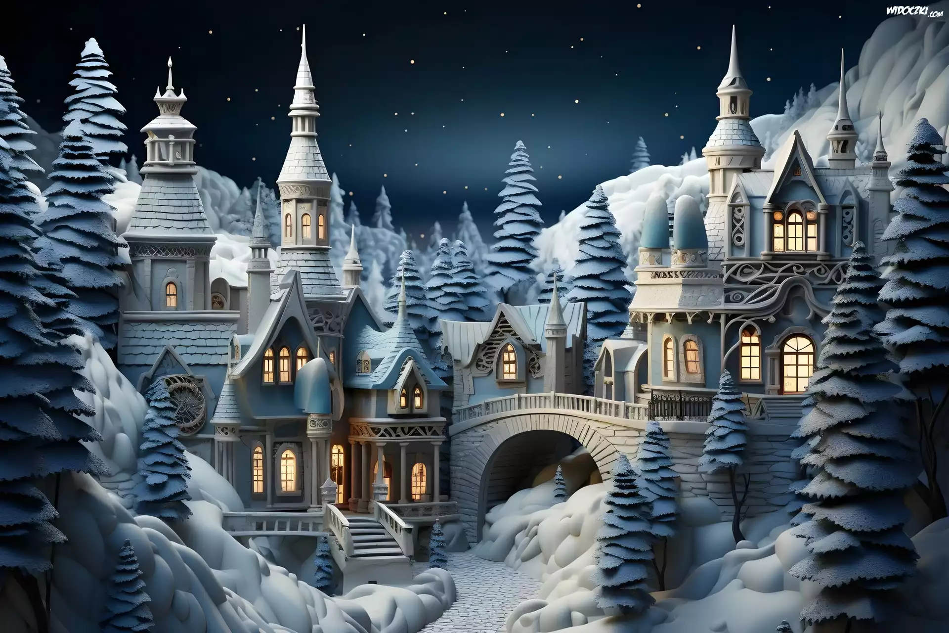 Zima, Bajkowy, Zamek, Noc, Grafika